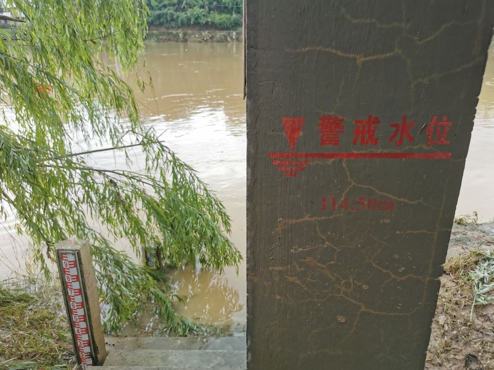 安徽省歙县渔梁水文站的下方基础柱上,用红色字体标记着警戒水位(7月9日摄)。记者姜刚摄