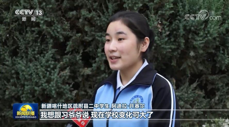 从设施到扶贫,从医疗到教育,发生在新疆的变化各族人民感同身受。疏附县二中学生阿迪拉告诉记者,2014年4月,习近平总书记来学校看望师生,还跟大家合了影。站在总书记右手边的就是阿迪拉,现在她已经是一名高中生了。