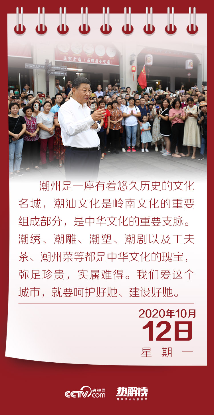 在潮州市牌坊街,习近平总书记如数家珍地点赞了潮绣、潮雕、潮塑、潮剧以及工夫茶、潮州菜等中华文化瑰宝,并表示:“潮州是一座有着悠久历史的文化名城,潮汕文化是岭南文化的重要组成部分,是中华文化的重要支脉。”