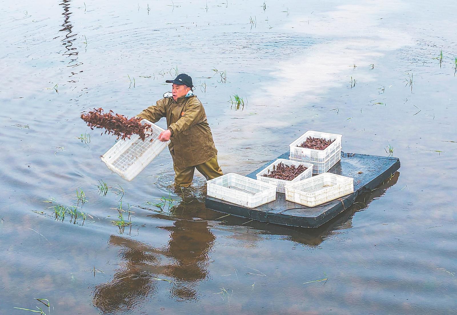 3月24日,芜湖市繁昌区平铺镇五华村,养殖工人在投放小龙虾苗。近年来,平铺镇以“稻虾轮作”模式大力发展小龙虾生态种养,实现“一田两用、一田双收”,促进农户增收致富。本报通讯员 鲁君元 摄