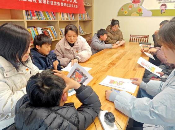 该项目严格遵循“寻、组、商、绘、展、维”六步工作法有序推进,本次冬日共创设计工作坊正是项目“商”环节的重要组成部分。首场活动以“红心向党”为主题进行设计稿创作,在社区二楼书吧举行。活动坚持党建引领,采用“1+N”分组模式,由1名网格党支部党员牵头,带领2名社区儿童和1名返乡大学生,共组成5个协作小组。活动中,党员首先讲述党员故事与社区历史,并发放红色主题简笔画作为创作参考。随后5个小组老中青共同协作完成创作。此次活动既帮助小朋友在实践中感悟红色精神,也为项目后续的设计共创积累了初步素材。