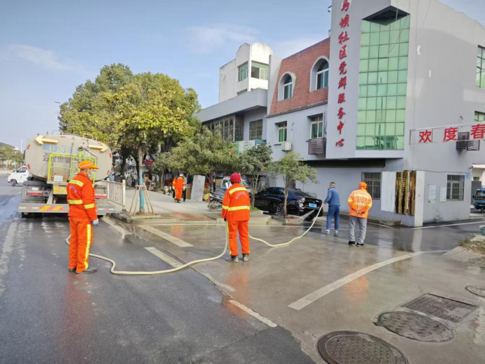 为达到“路见本色”的深度保洁效果,社区还协调保洁公司出动扫地车、洒水车进行机械化作业。伴随着扫地车、洒水车缓缓驶过,路面瞬间高光洁净。工作人员用高压水枪对人行道及路面污渍进行强力冲刷,将长期沉积的灰尘和泥垢一洗而净。在机械冲刷后,志愿者们紧随其后,对路面残留积水进行推扫,确保路面干净整洁,“洗”出了新年味。
