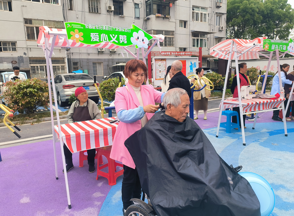上午九时三十分,暖心亭广场便民服务区人头攒动、秩序井然。爱心义剪点位前,志愿者手法娴熟,为老年人和儿童提供细致周到的免费理发服务;缝补衣物摊位旁,针线在指尖穿梭,一件件破损衣物焕发新颜。健康驿站区域更是排起长队,社区医生逐一为居民测量血压、血糖,并结合测量结果提供个性化健康指导;合作医疗机构携带的骨密度、体脂检测等便携式仪器也备受关注,居民在家门口即享受到便捷的健康筛查服务。现场一位年过七旬的李大爷感慨道:“理发、补衣服、量血压一趟全办齐了,社区把服务送到了我们心坎上。”