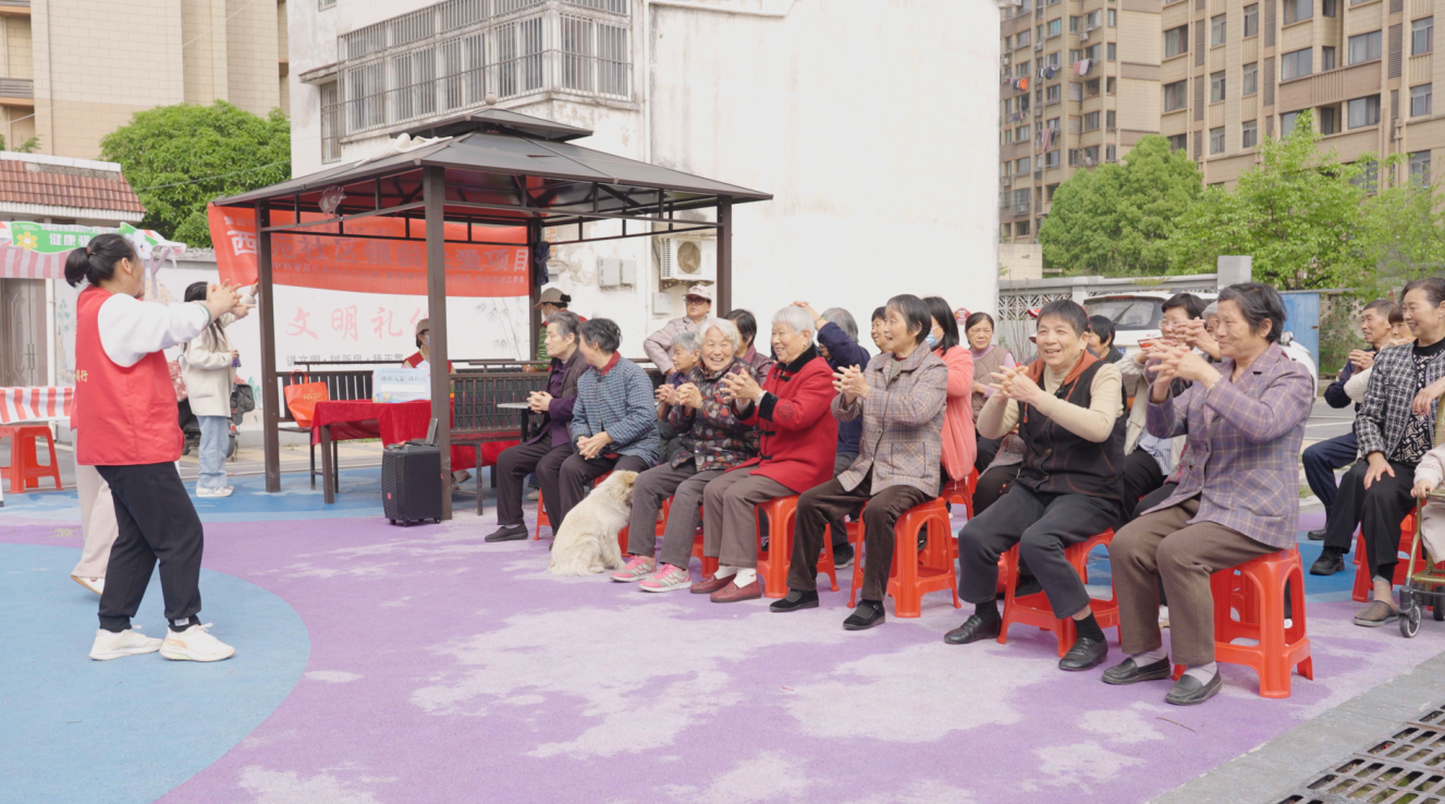 为增进居民情感交流,活动现场特别设置了文娱互动区。在“欢乐套圈”环节,居民凭参与券有序体验,老少同场、兴致盎然,套中奖品的欢呼声此起彼伏,轻松欢快的氛围拉近了邻里距离。与此同时,“银龄舞韵”手势舞教学互动温情上演,带领人耐心示范简单易学的手势动作,老年朋友们跟随节拍舒展身姿,在律动中舒展筋骨、愉悦身心,现场洋溢着其乐融融的邻里情谊。